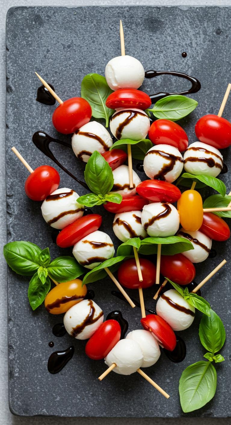 - Thread tomatoes, mozzarella, and basil onto toothpicks.