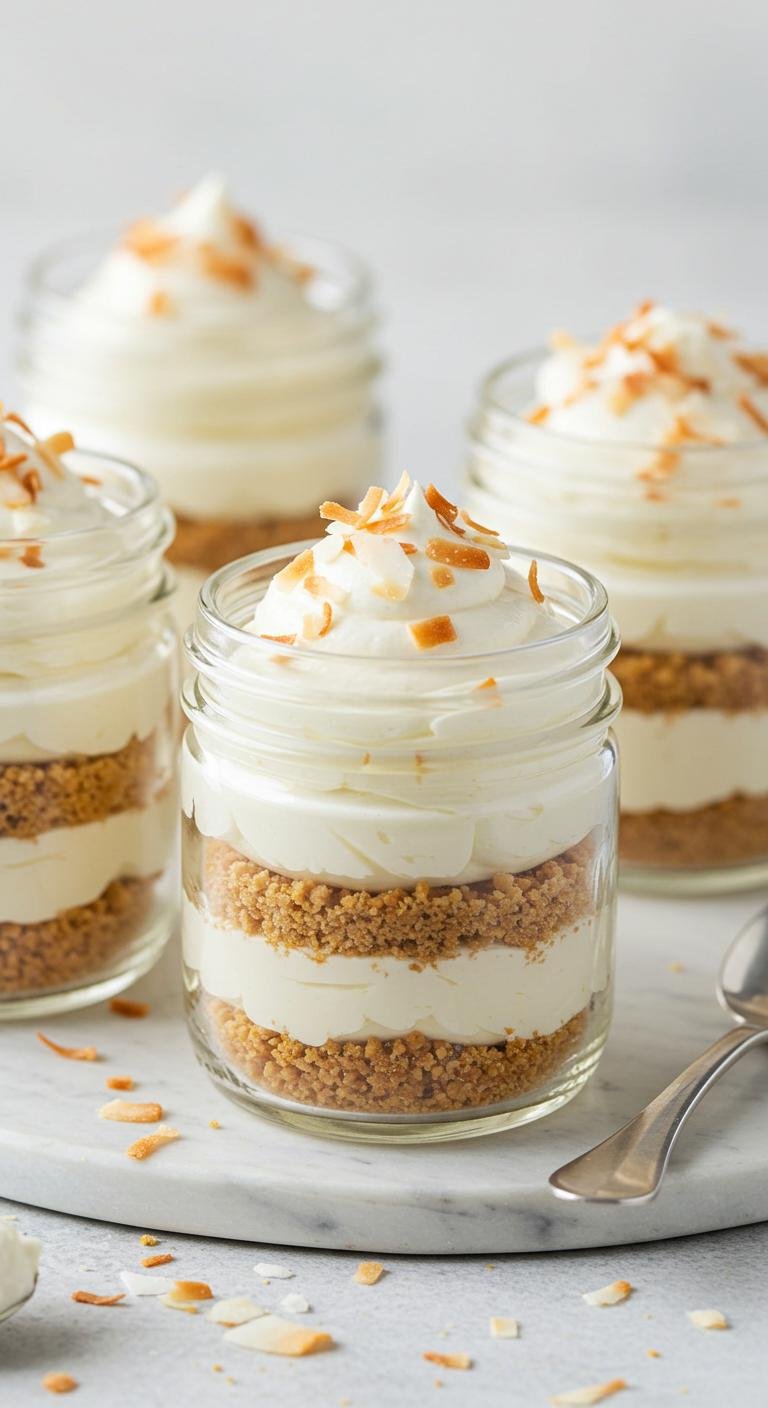 - Layer coconut cream and graham cracker crumbs in small jars.