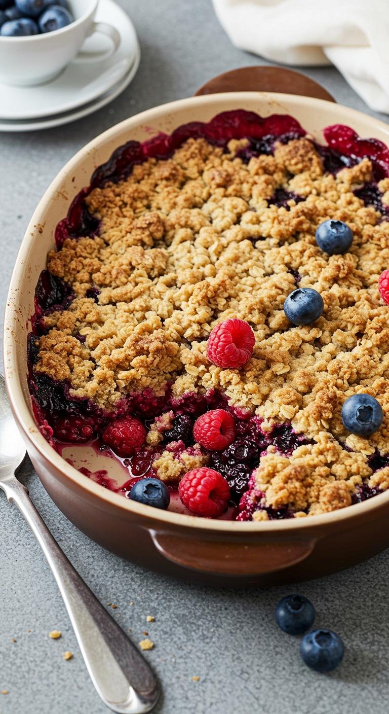 - Mix oats, flour, honey, and cinnamon; sprinkle over berries and bake for 25 minutes.