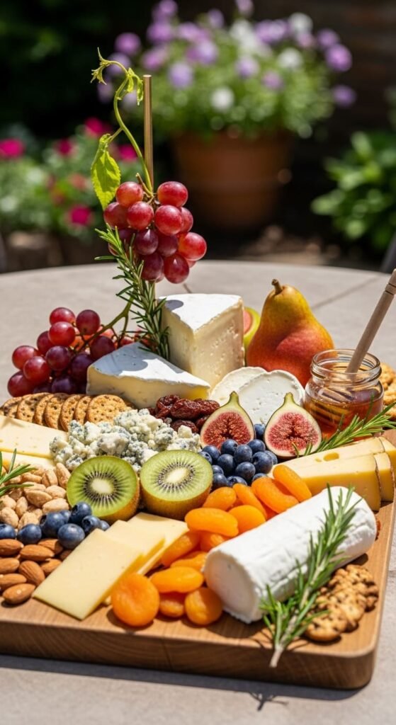 - Arrange cheese, fruits, and crackers on a board.