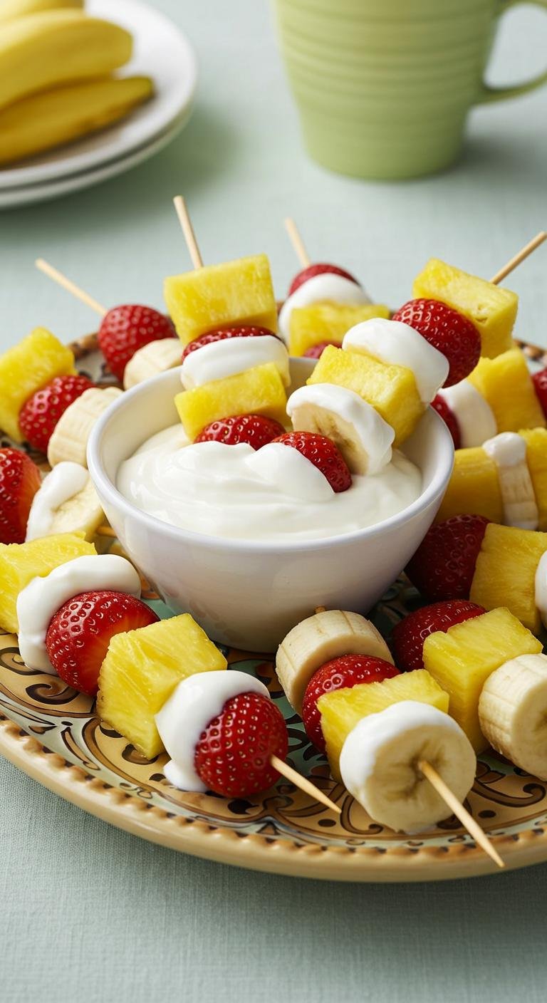 - Dip fruit pieces in yogurt, ensuring they are fully coated.