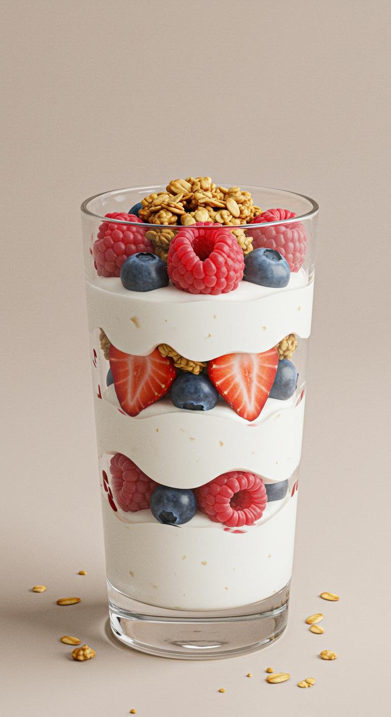 - In a glass, layer yogurt, granola, and berries.