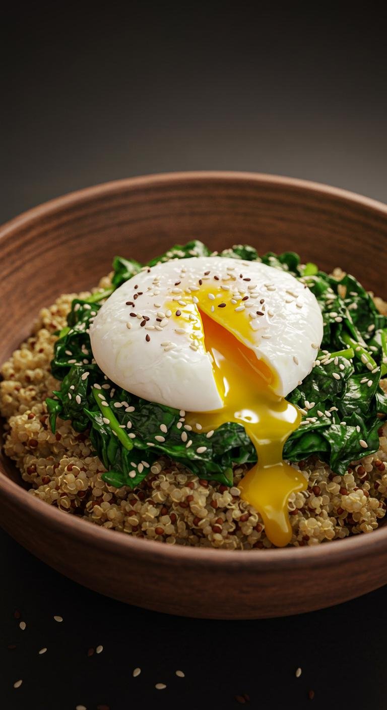 - Top with a poached egg and sprinkle sesame seeds.