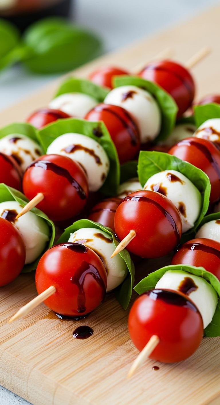 - Thread tomatoes, mozzarella, and basil onto skewers.