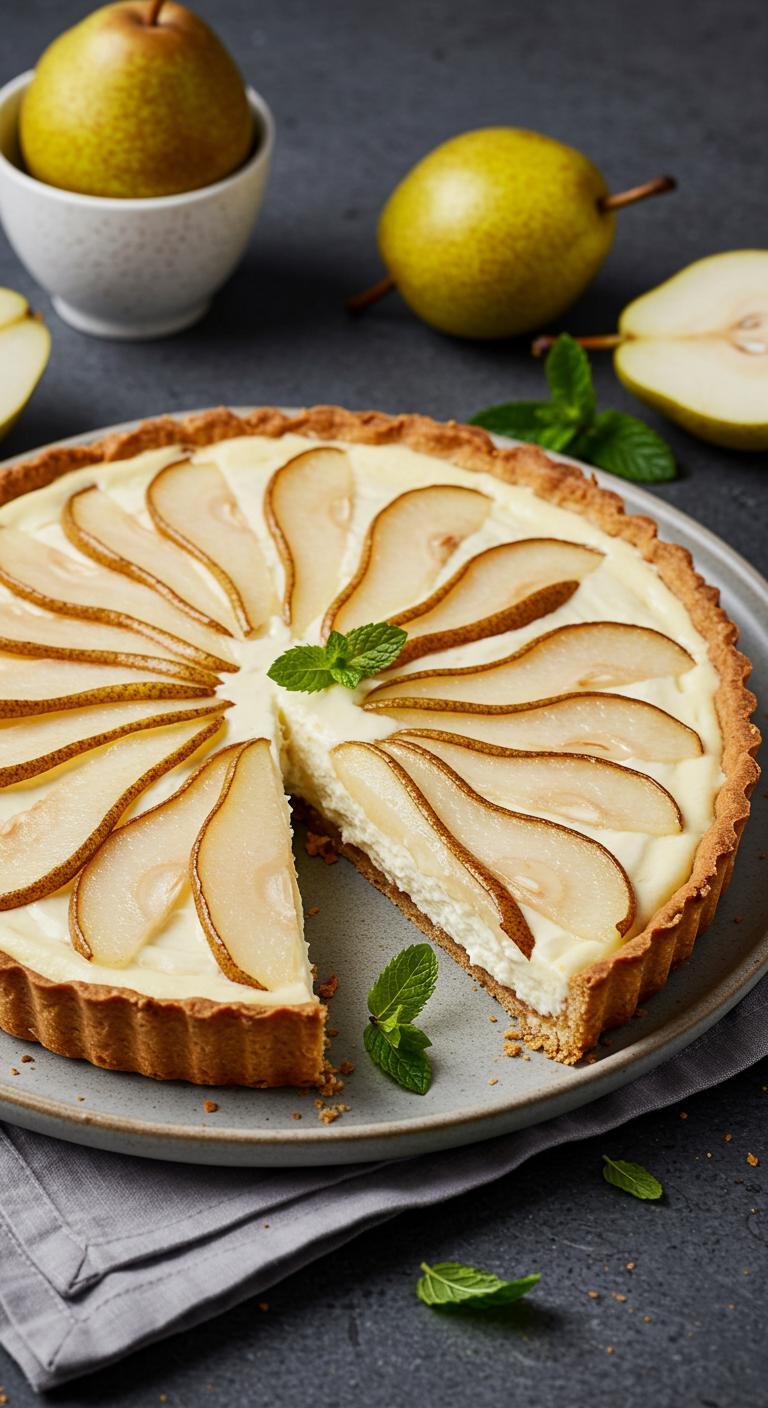 - Pour mixture into the tart shell and arrange pear slices on top.
