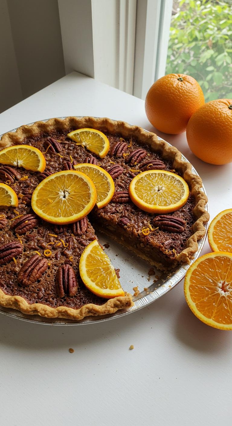 - Preheat oven to 350°F (175°C). Whisk together corn syrup, sugars, eggs, butter, orange juice, and zest.