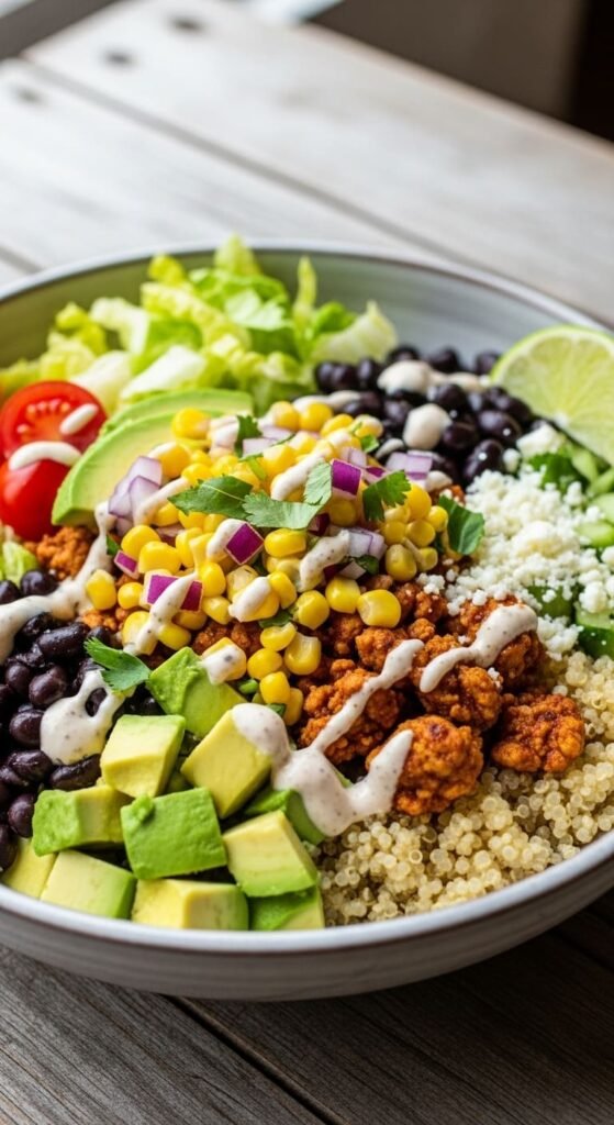 - In a bowl, layer quinoa, beans, corn, and avocado.