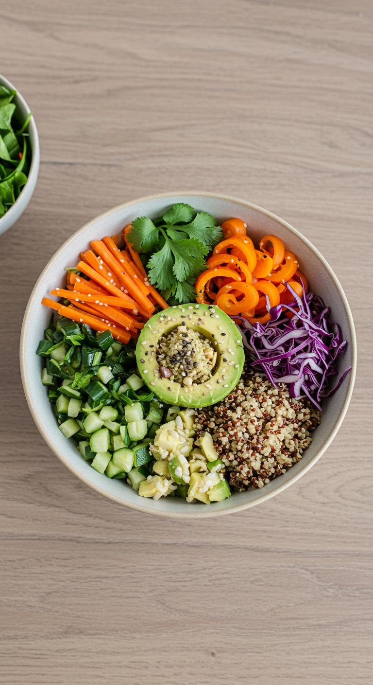 - Arrange quinoa at the base of the bowl; artfully place veggies and avocado on top.