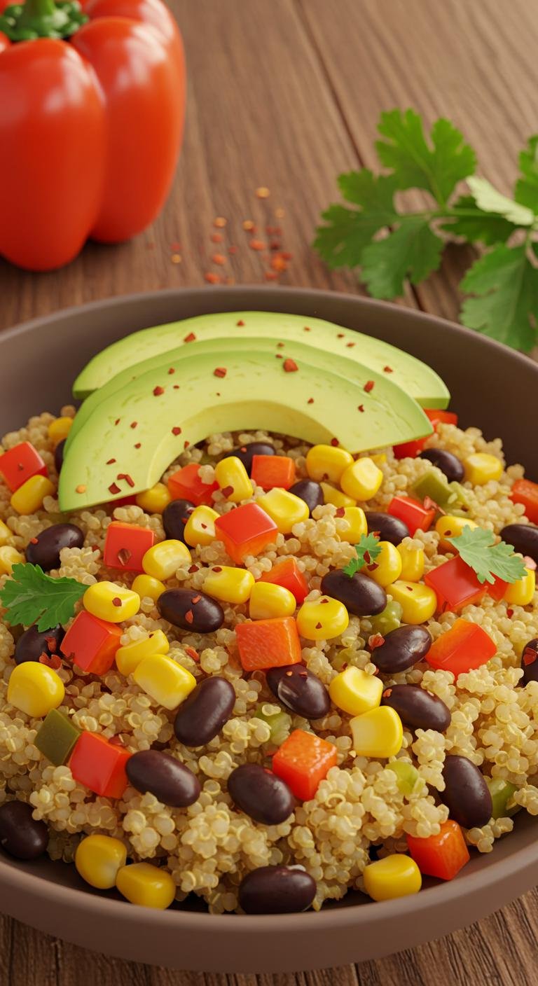 - Combine quinoa, black beans, corn, and bell pepper in a bowl.