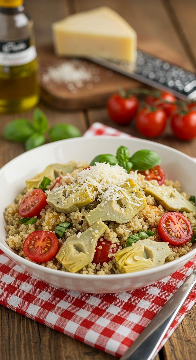 - In a bowl, mix quinoa, artichokes, tomatoes, and basil.