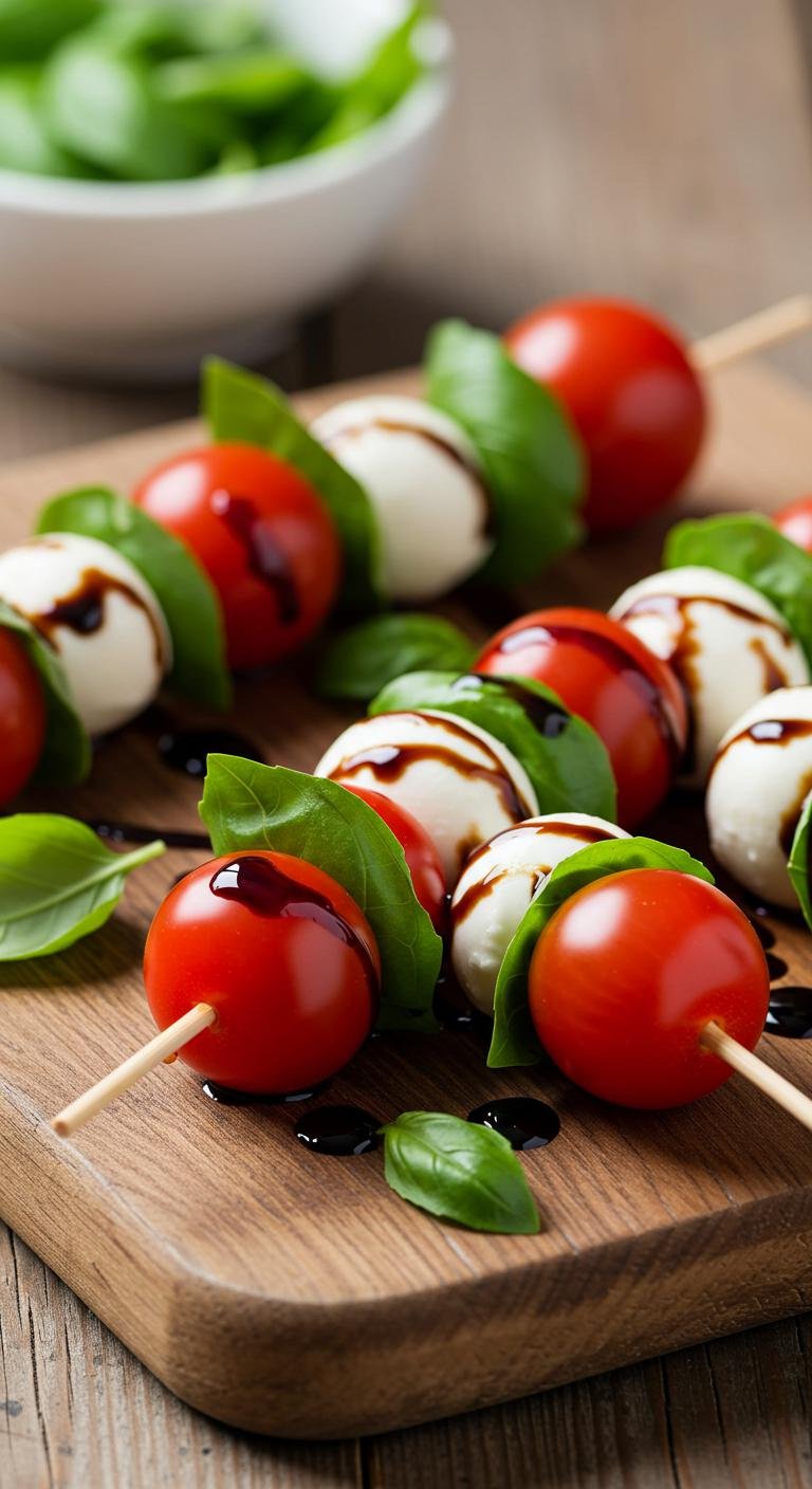 - Thread a cherry tomato, a mozzarella ball, and a basil leaf onto a skewer.