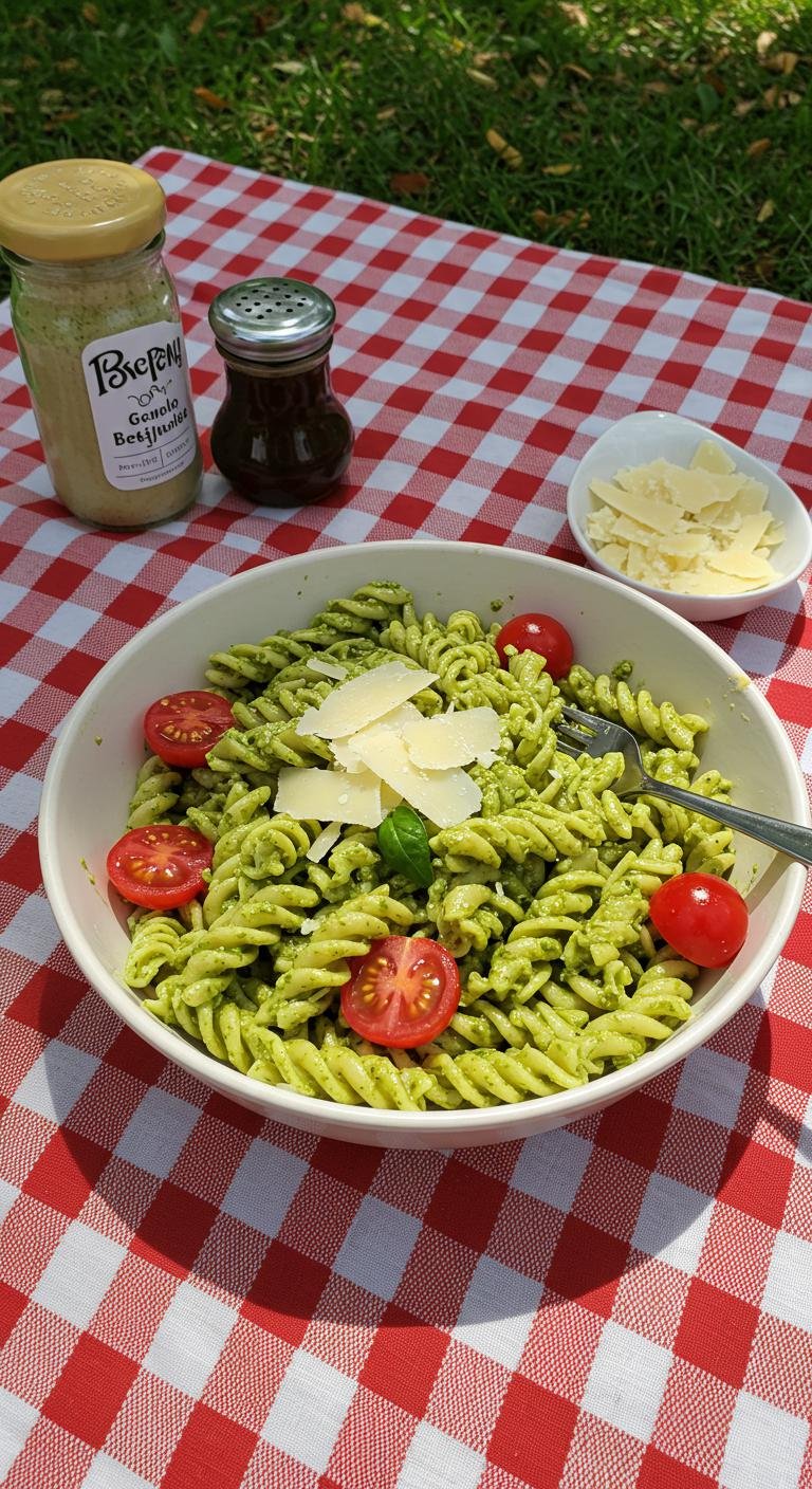 - In a large bowl, combine cooked pasta and pesto sauce.