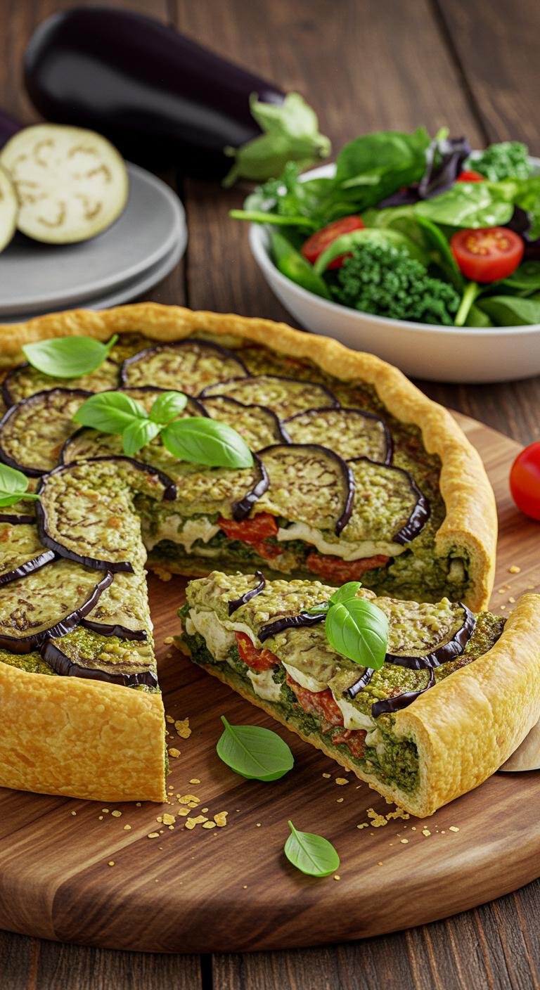 - Layer eggplant, pesto, and cheese in the pie crust.