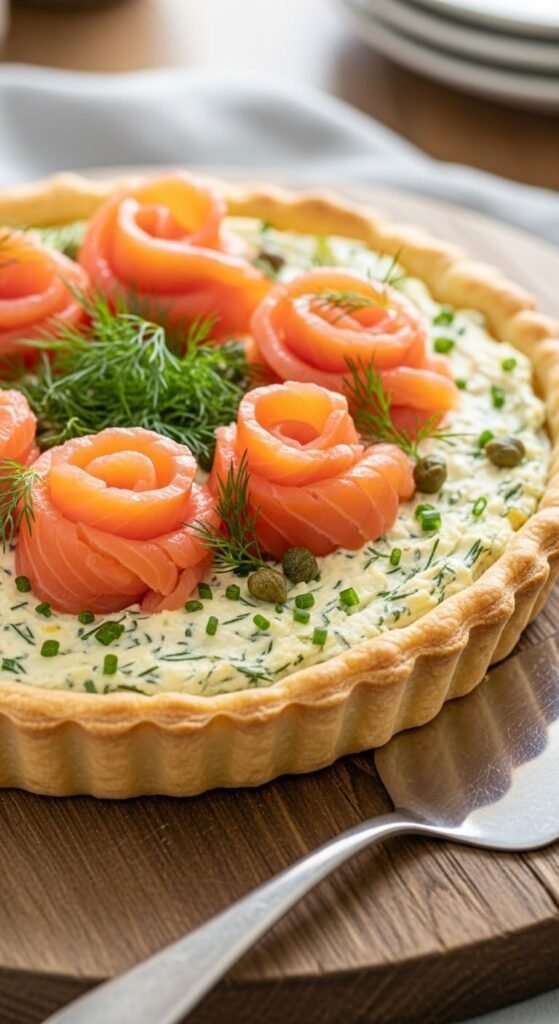 - Spread cream cheese evenly in the tart shell. Top with smoked salmon and capers.