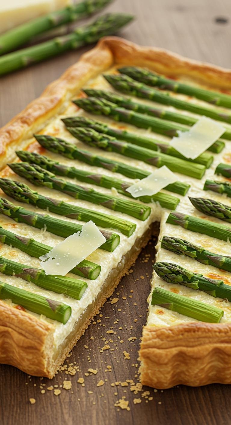 - Mix cream, eggs, and Parmesan. Pour into the crust, then layer asparagus on top. Bake for 25 minutes.