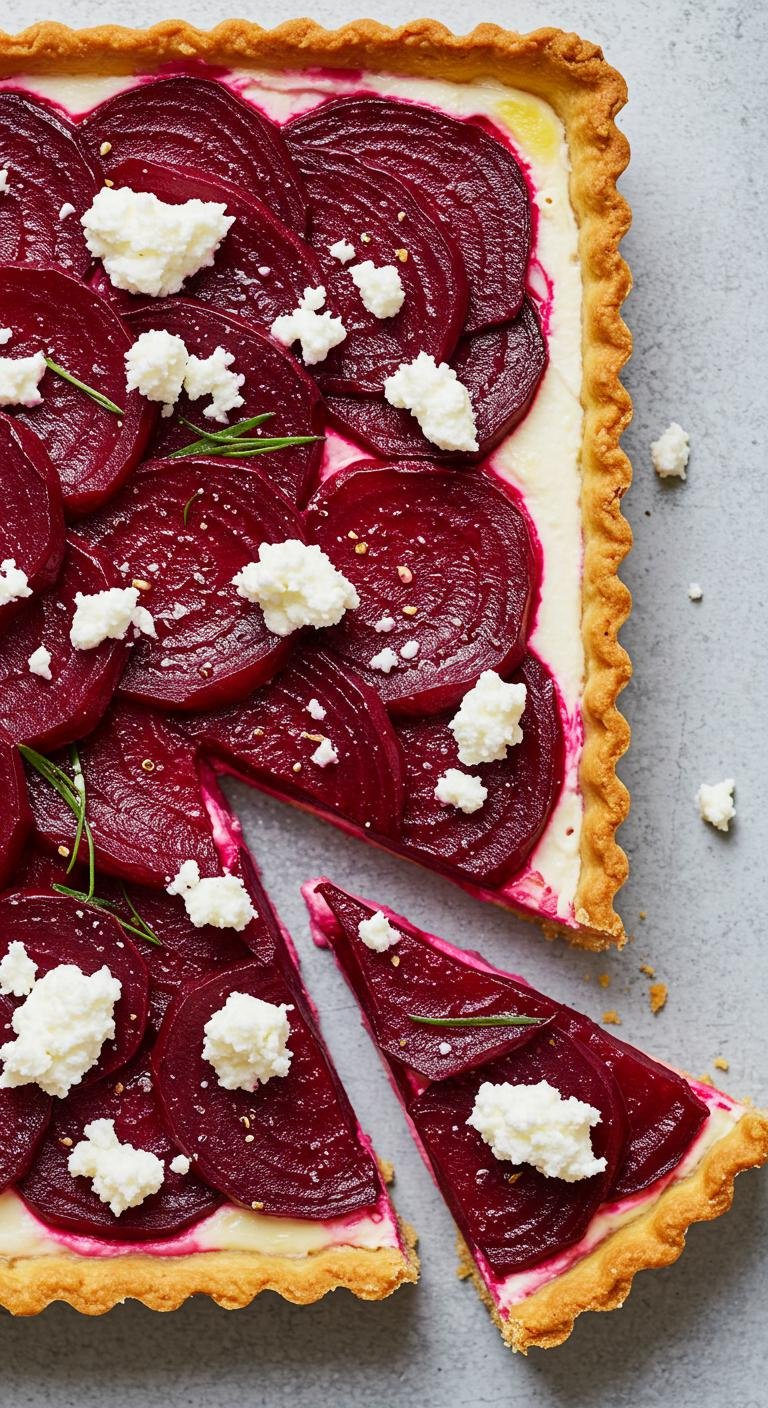 - Preheat the oven to 375°F (190°C). Arrange beets in the tart shell and sprinkle with goat cheese.