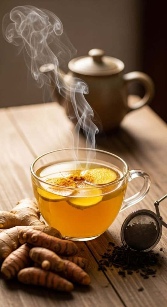 - Boil water and add ginger and turmeric; simmer for 10 minutes.