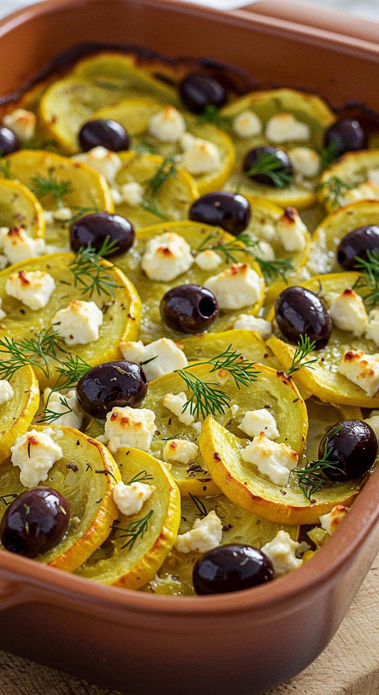 - Layer squash, feta, olives, oregano, and marinara in a baking dish.