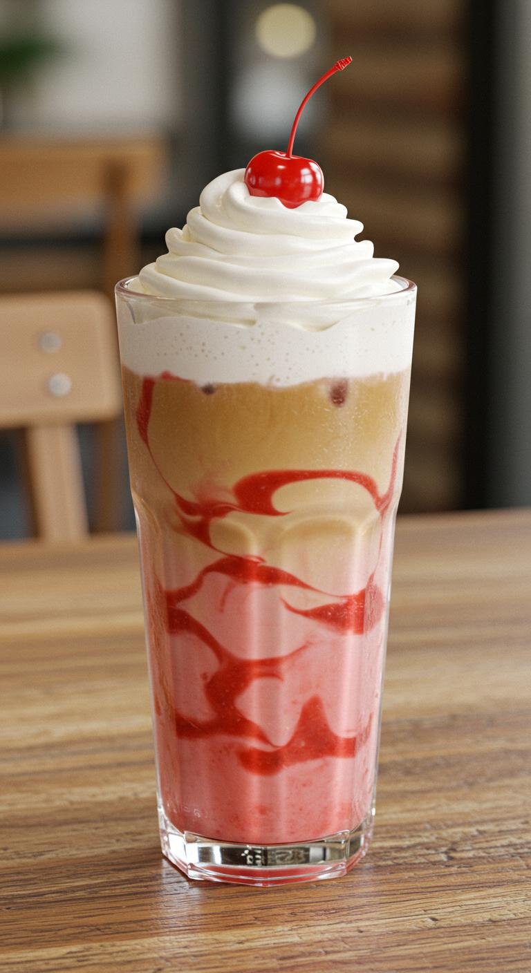- Mix cooled espresso, milk, and strawberry puree in a glass.