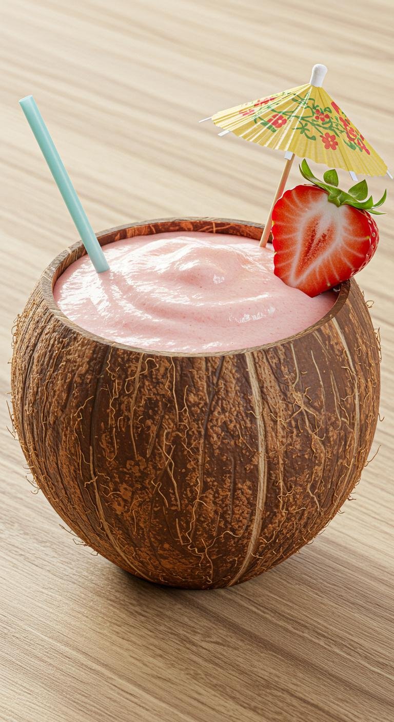 - Blend strawberries, coconut cream, rum, and lime juice with ice until slushy.