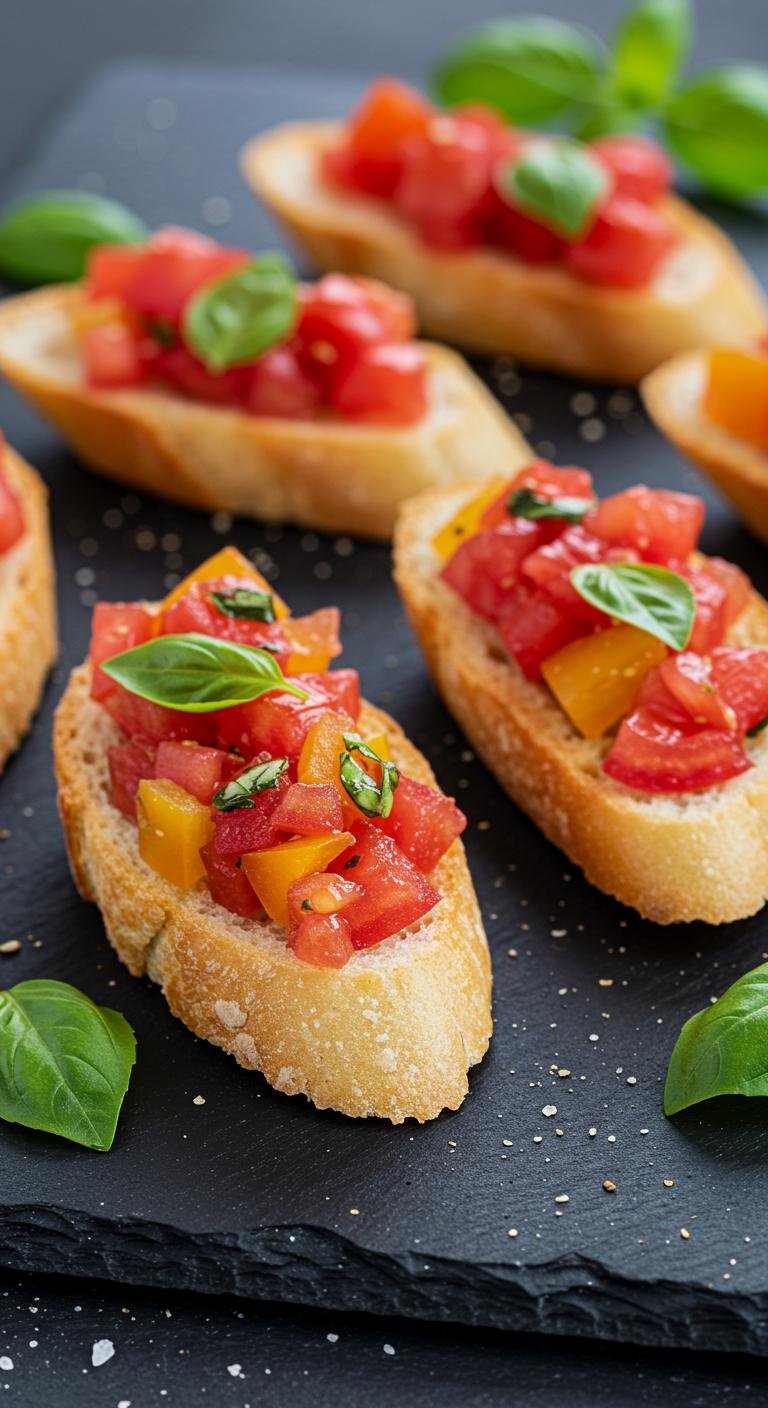 - Mix tomatoes, basil, olive oil, vinegar, salt, and pepper. Top each slice.