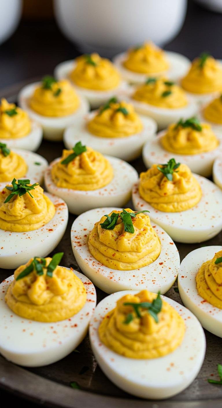 - Mix yolks with mayo, mustard, salt, and pepper. Fill egg whites.