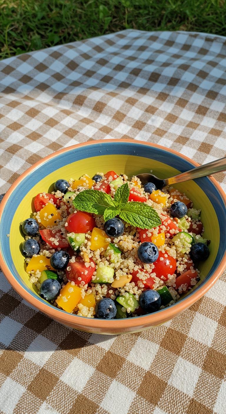 - In a bowl, combine quinoa, blueberries, cucumber, and onion.