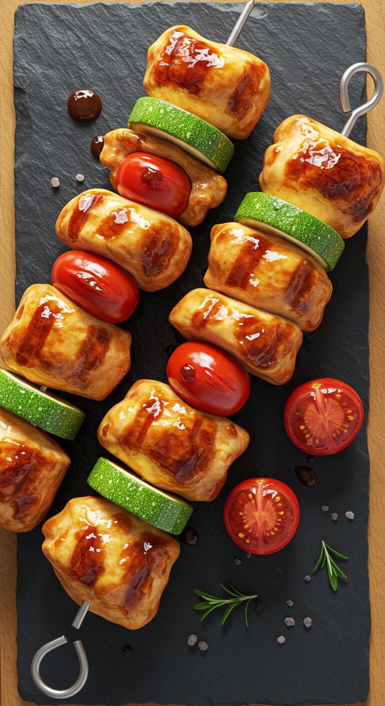 - Skewer chicken with bell peppers and zucchini, then grill for 10-12 minutes.