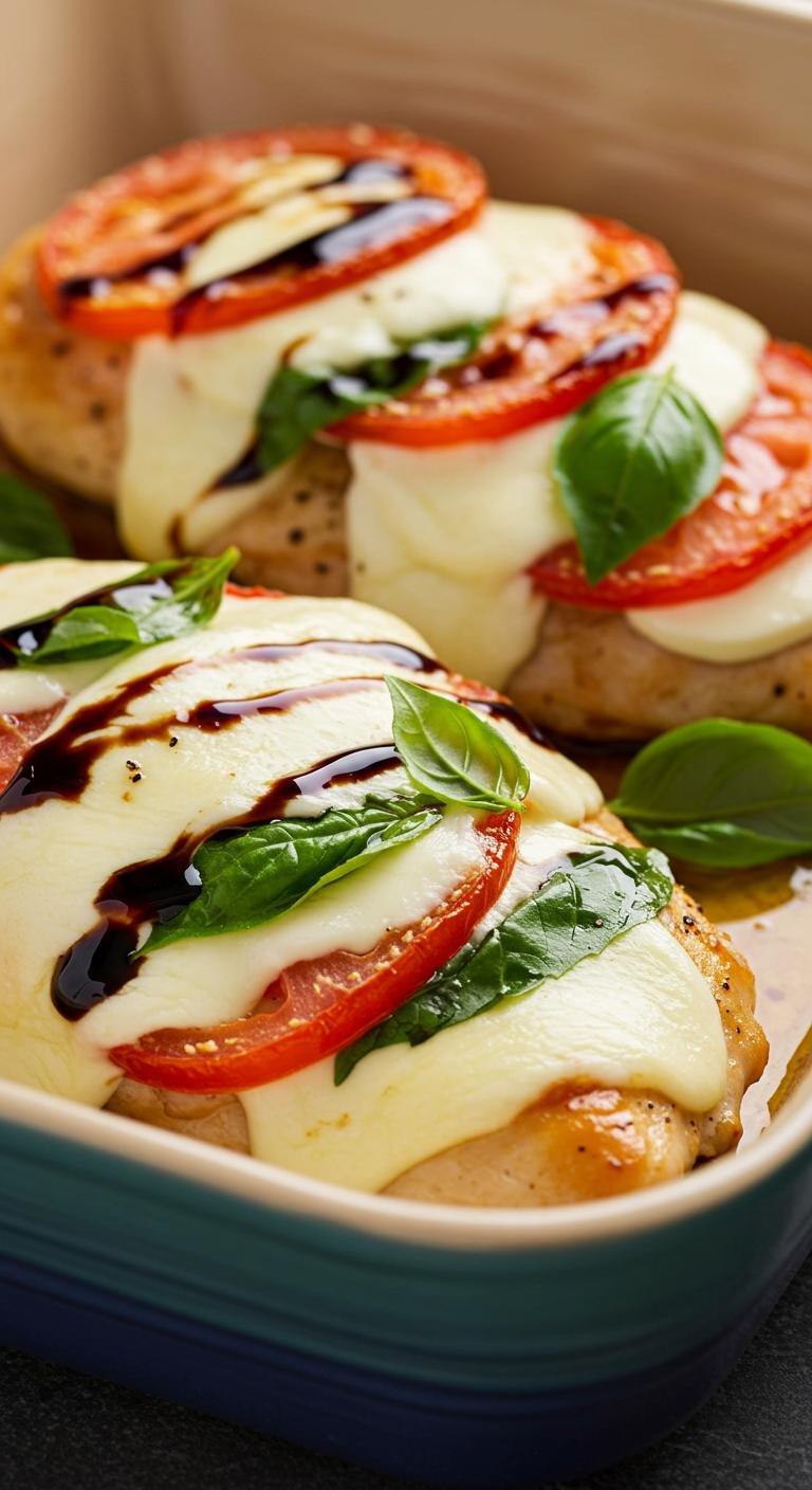 - Place chicken in a dish, top with tomatoes and mozzarella.