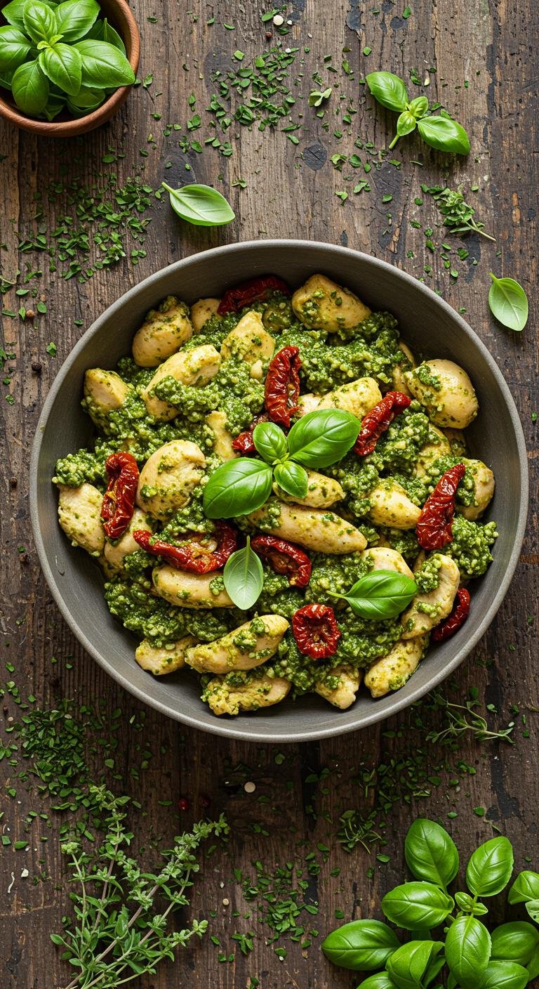 - Combine chicken, pesto, sun-dried tomatoes, and spinach in a bowl.