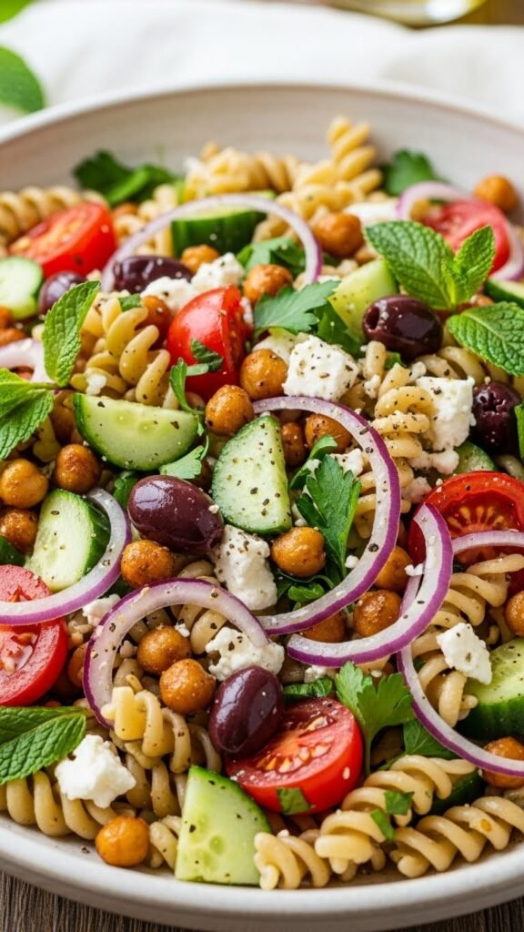 - In a bowl, combine chickpea pasta, chickpeas, tomatoes, feta, and olives.