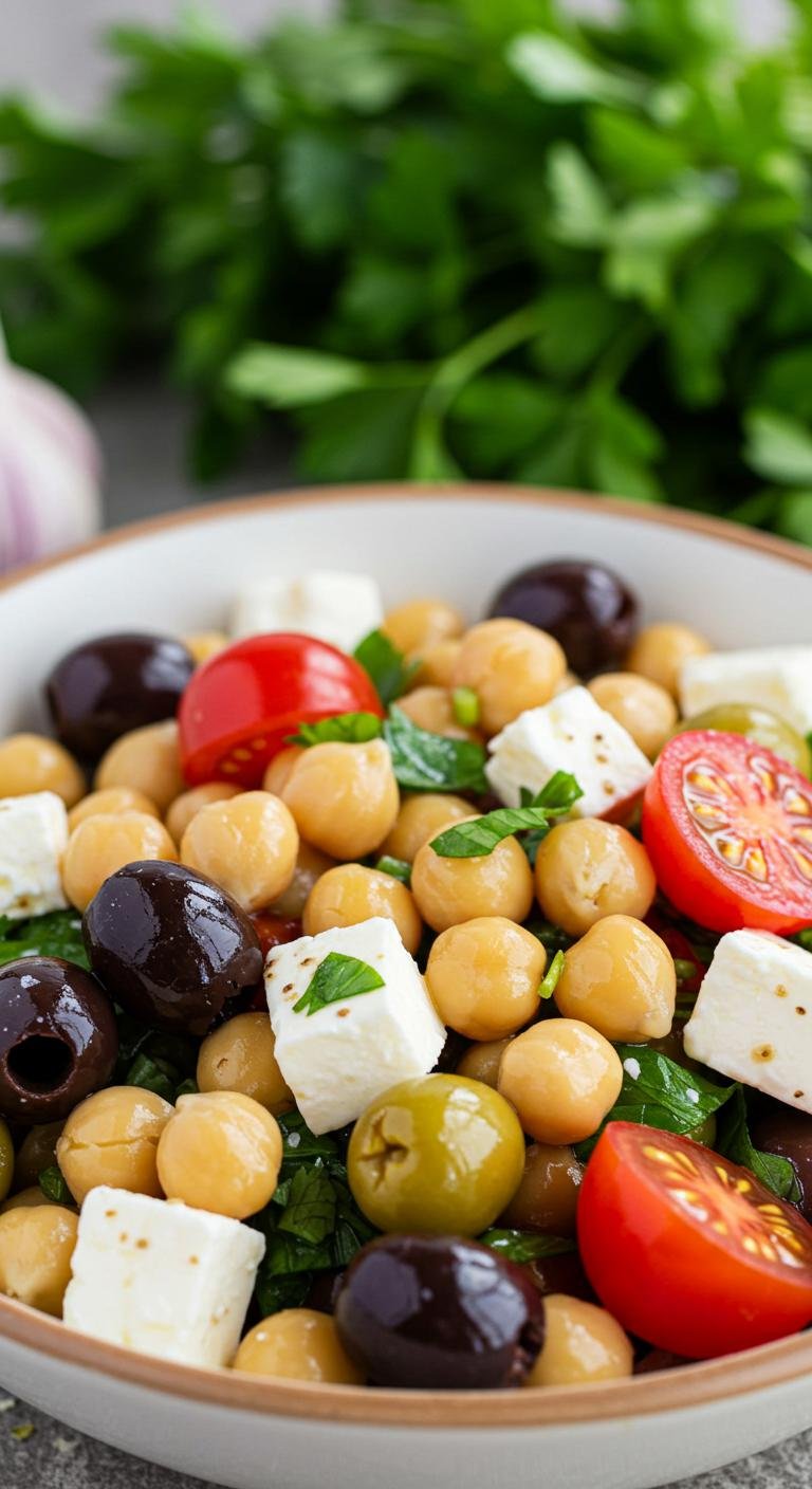 - In a large bowl, combine the chickpeas, tomatoes, cucumber, feta, and olives.