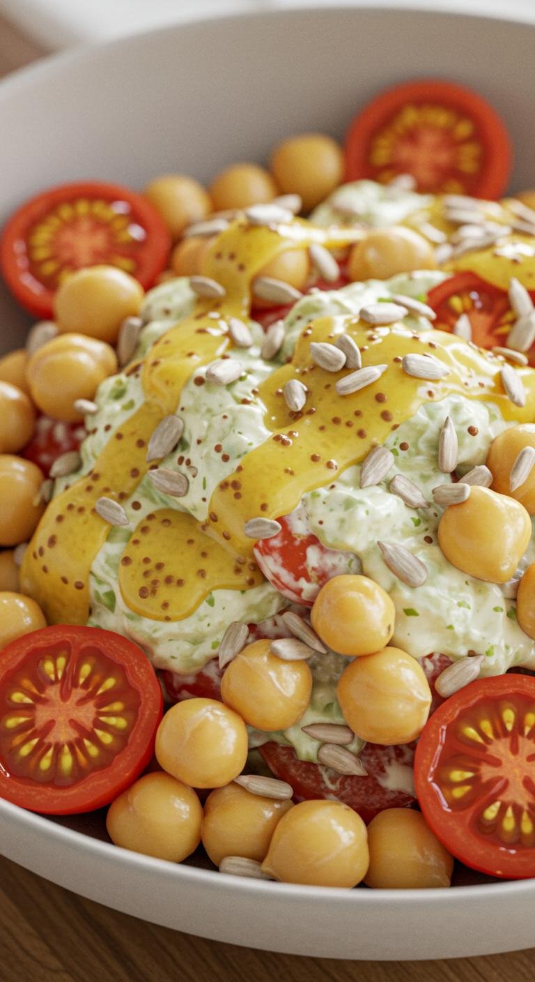 - In a bowl, mix the chickpeas and tomatoes with sunflower seeds.