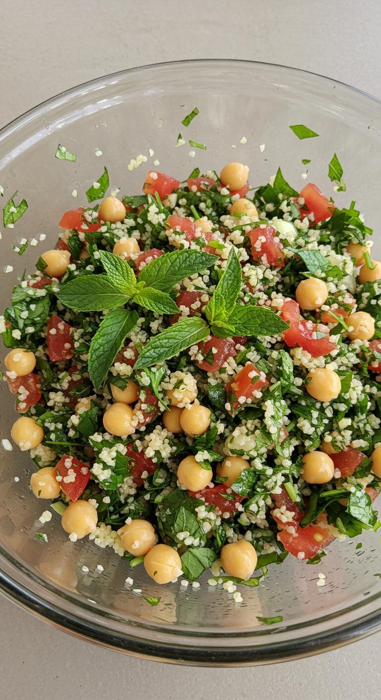 - In a large bowl, combine chickpeas, bulgur, parsley, mint, and tomatoes.