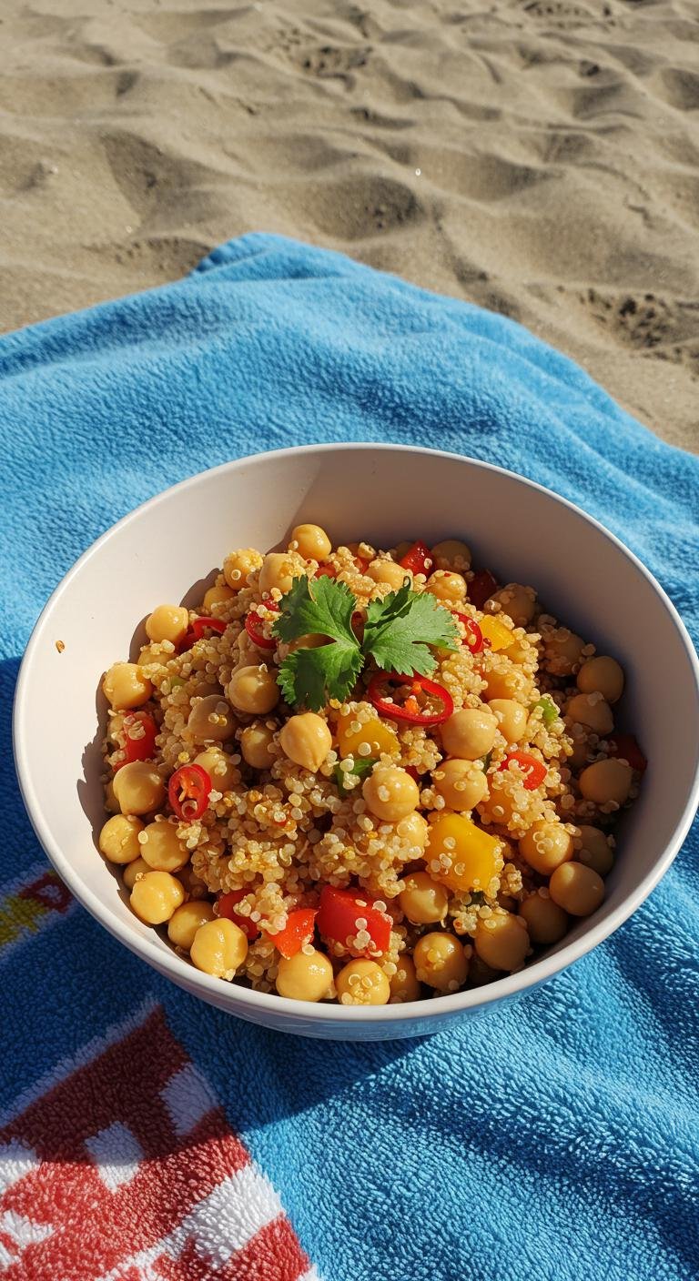 - In a bowl, mix chickpeas, quinoa, bell pepper, and avocado.