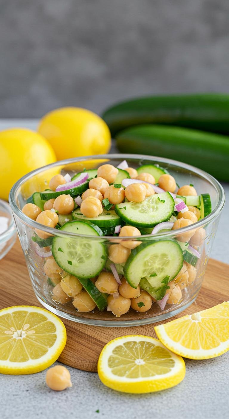 - Combine chickpeas, cucumber, and onion in a bowl.