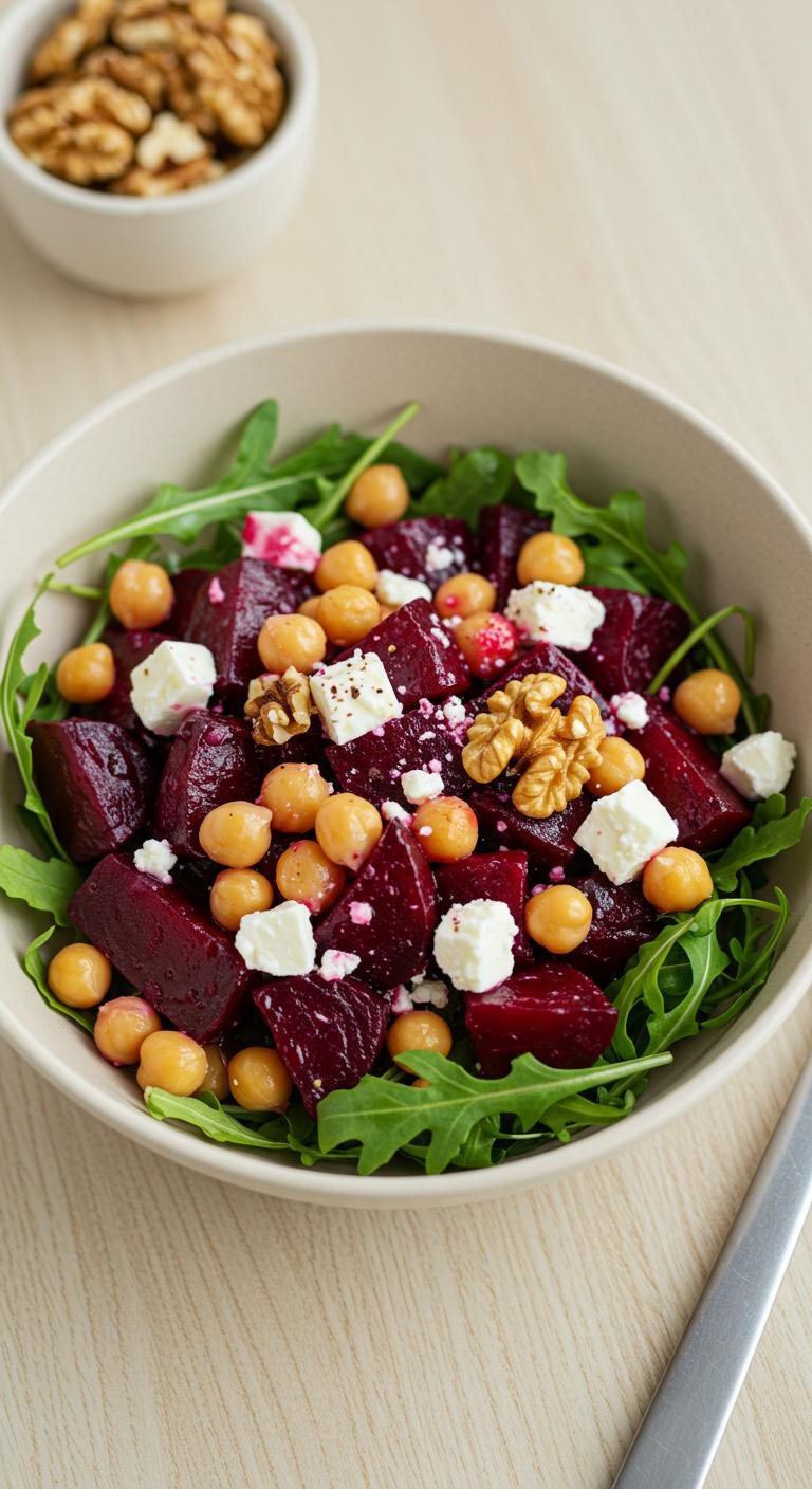 - In a large bowl, mix chickpeas, beetroot, and arugula.