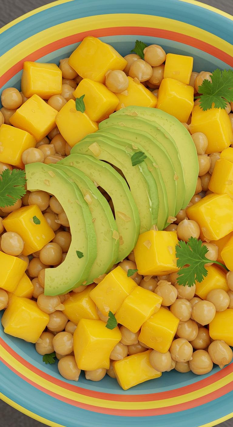 - In a bowl, combine chickpeas, mango, avocado, and bell pepper.