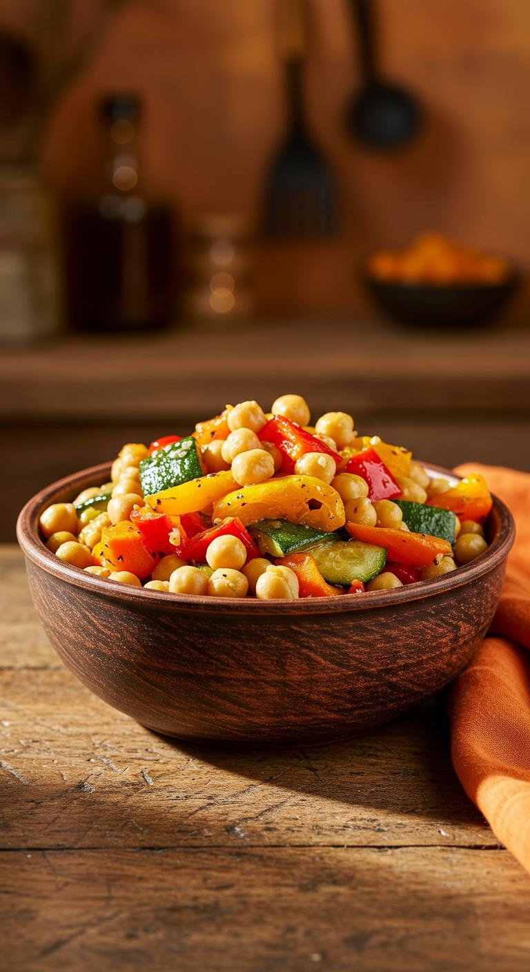 - Toss chickpeas and vegetables with olive oil, garlic powder, salt, and pepper.