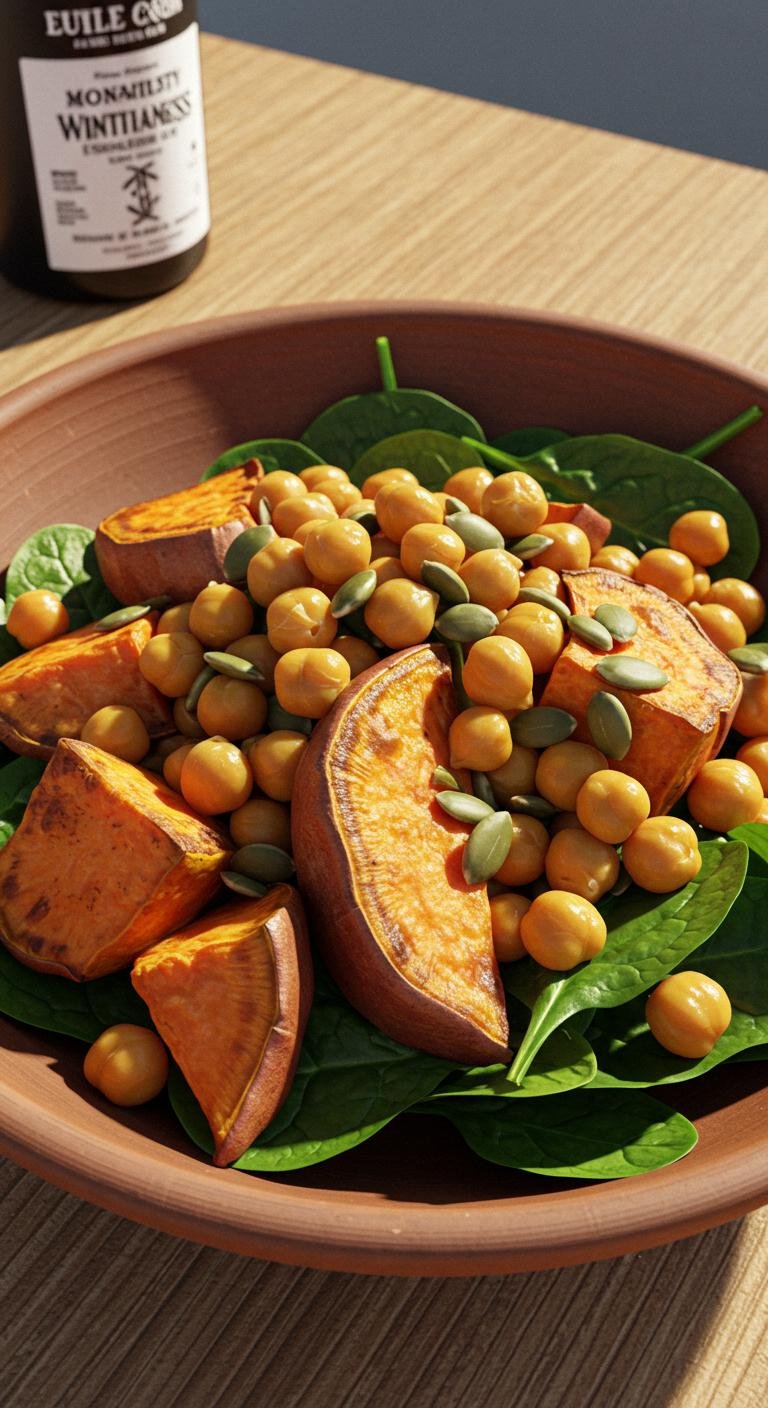- In a bowl, combine chickpeas, sweet potato, and spinach.
