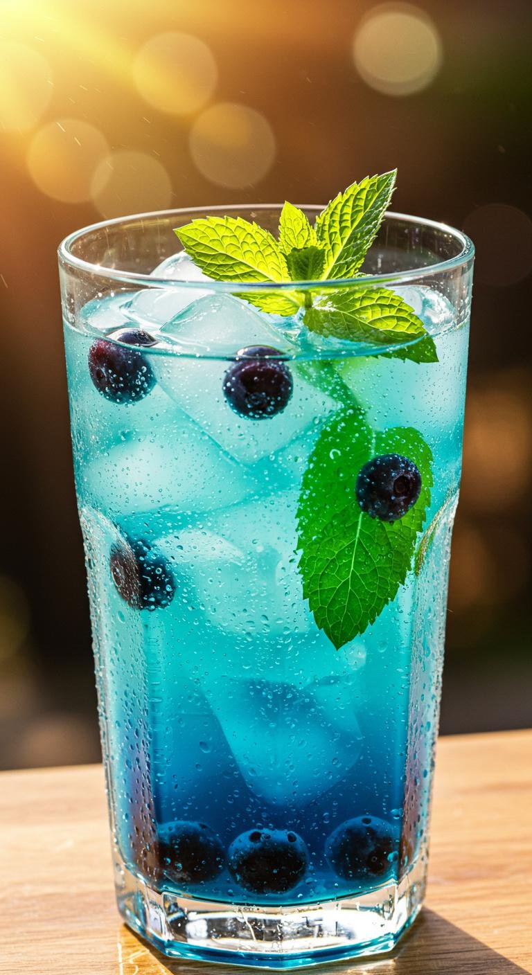 - Blend blueberries, lime juice, mint leaves, and ice.