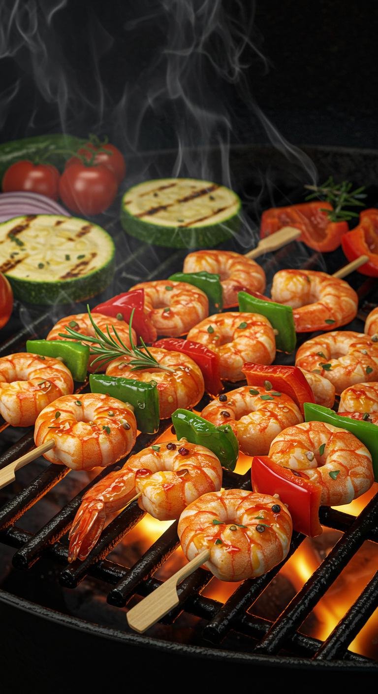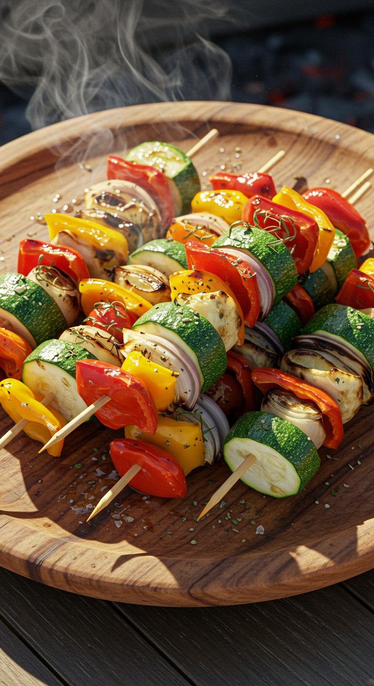 - Thread veggies onto skewers, brush with olive oil, and season with salt and pepper.