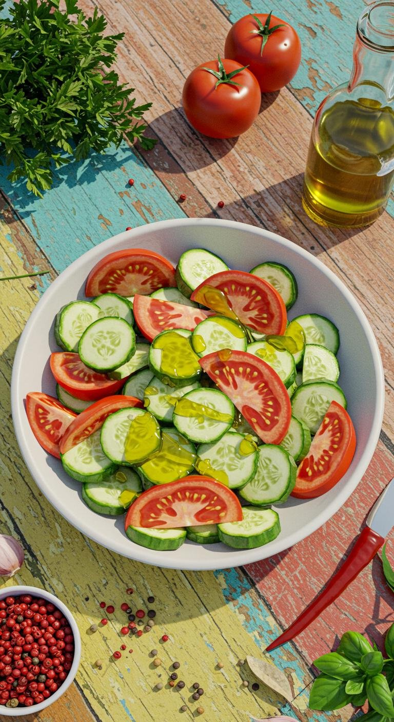 - In a large bowl, combine cucumbers, tomatoes, and onion.