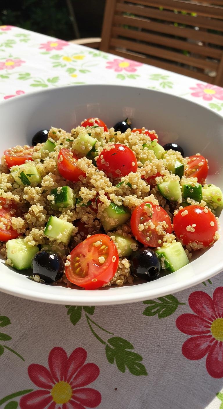 - In a bowl, mix cooked quinoa with tomatoes, cucumber, olives, olive oil, salt, and pepper.