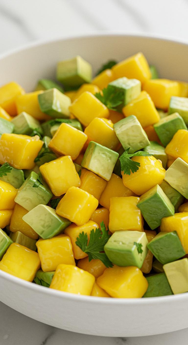 - In a bowl, combine avocado, mango, onion, and lime juice.
