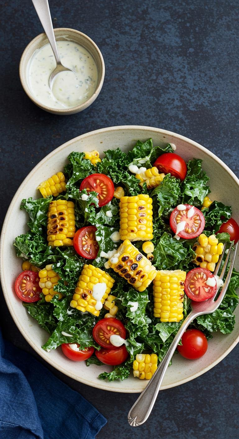 - Mix kale with grilled corn and cherry tomatoes in a large bowl.