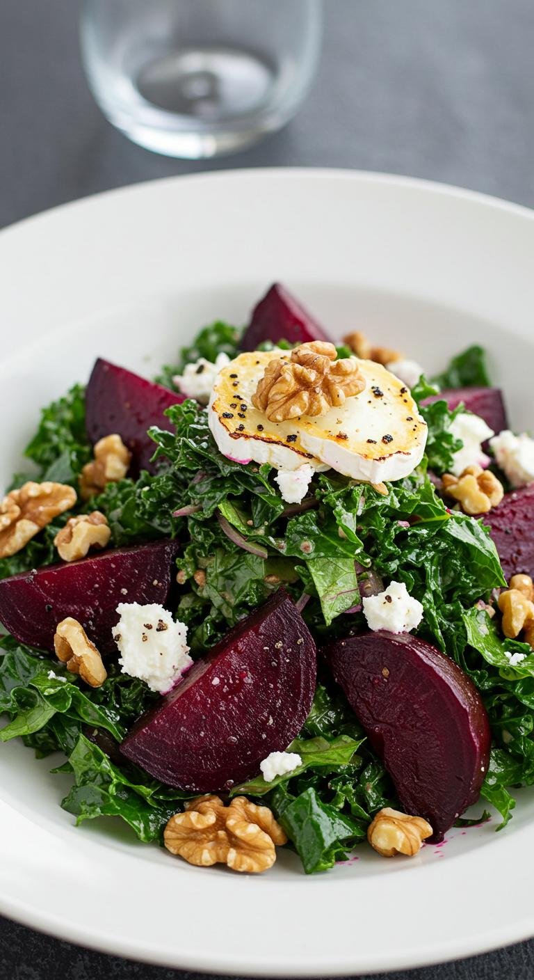 - In a bowl, combine kale, roasted beets, goat cheese, and walnuts.