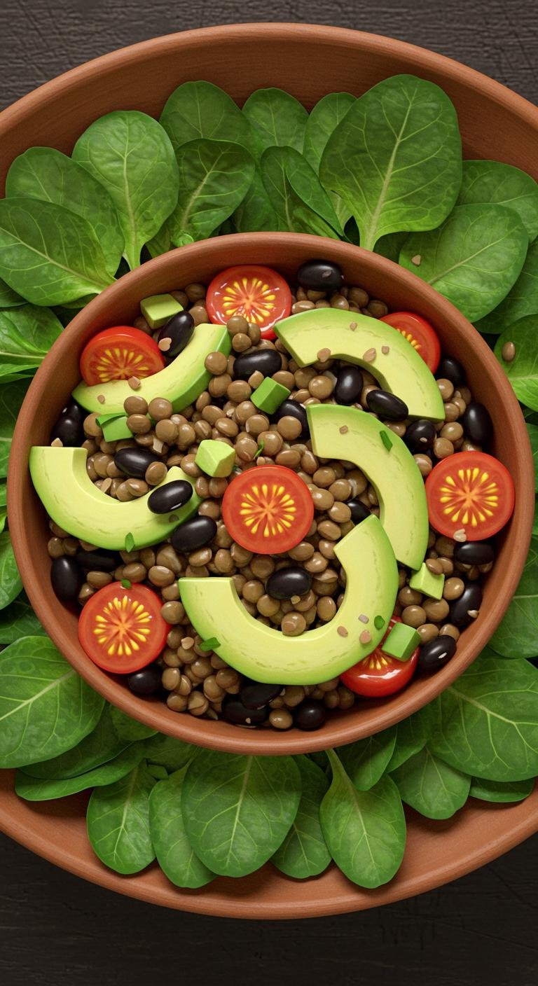 - Combine lentils, black beans, avocado, and tomatoes in a large bowl.
