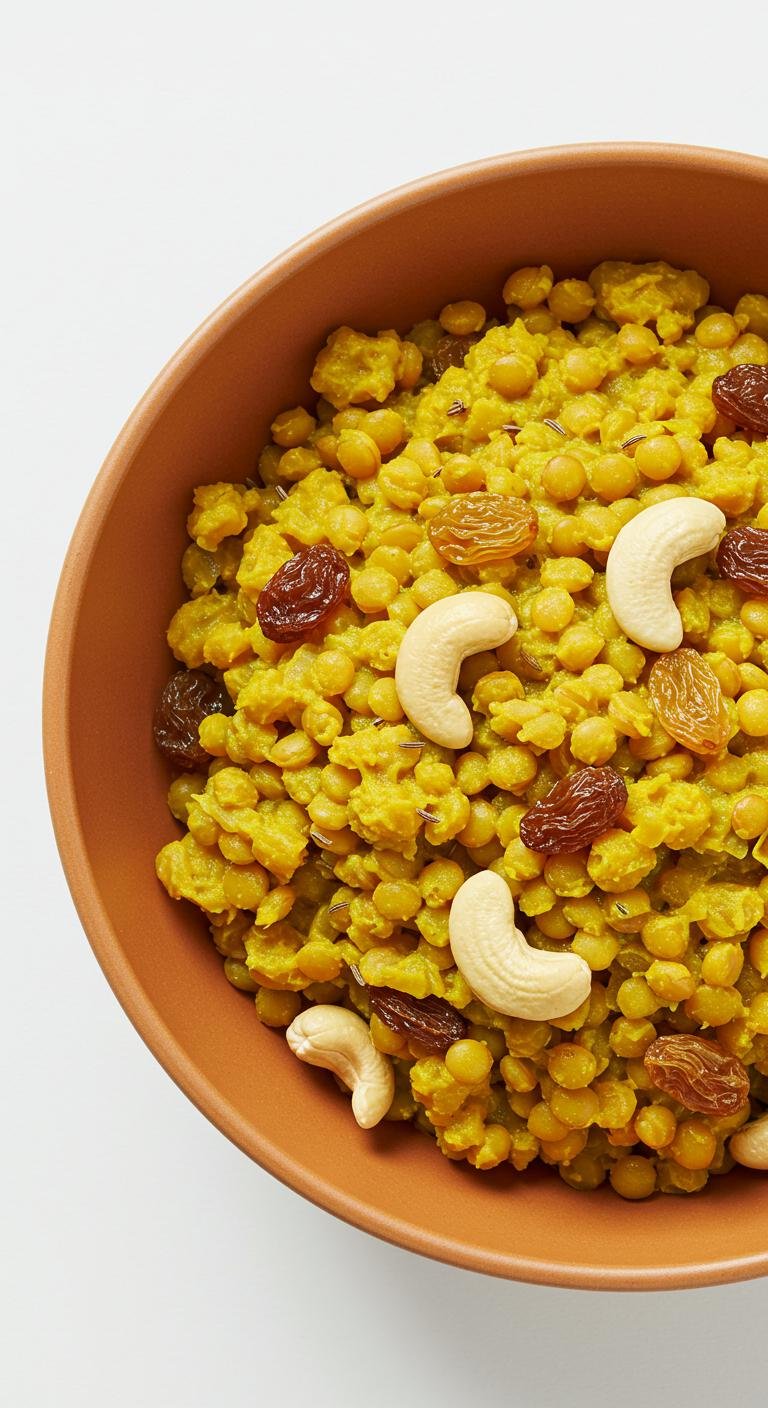 - Mix cooked lentils with raisins, cashews, curry powder, and salt.