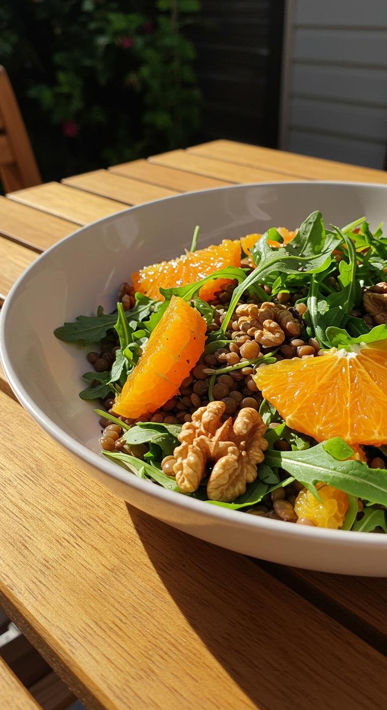 - Combine lentils, orange segments, arugula, and walnuts in a bowl.